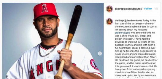 “¡Hoy es el primer día de la última temporada de una de las carreras deportivas más destacadas! Me refiero a mi esposo Albert Pujols que desde niño comía, dormía y respiraba este deporte”, leía parte del post.