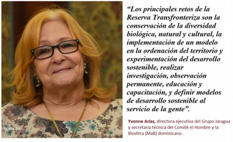 Yvonne Arias: “El MaB haitiano (bajo el liderazgo de Emmanuel Philippe, del Ministerio de Medio Ambiente) y el dominicano han realizado varias reuniones en las que se ha discutido el concepto de Reserva Transfronteriza y se ha trabajado en acuerdos para impulsar la gestión de la Reserva. Los principales retos de la Reserva Transfronteriza son la conservación de la diversidad biológica, natural y cultural, la implementación de un modelo en la ordenación del territorio y experimentación del desarrollo sostenible, realizar investigación, observación permanente, educación y capacitación, y definir modelos de desarrollo sostenible al servicio de la gente”.